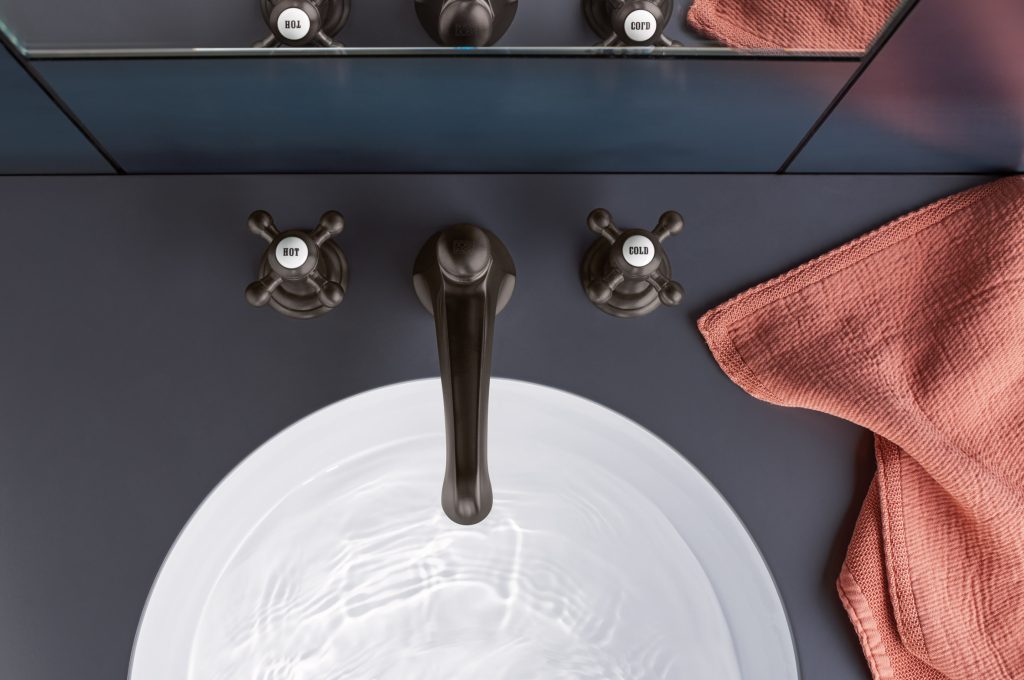 Die neue Designarmatur von Dornbracht Madison in Dark Platinum gebürstet ergänzt sich gut mit kräftigen, expressiven Farbtönen.